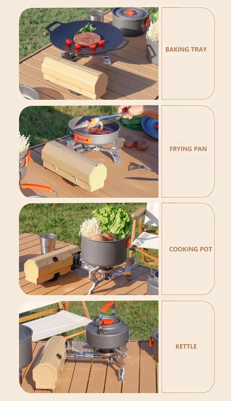 Its folding and compact design makes it easy to carry and store, while the stable base ensures safe cooking outdoors. Ideal for quick meals, boiling water, or brewing tea and coffee at your campsite.